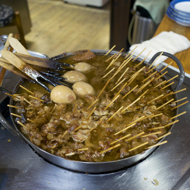 甲府駅から10分ほどの位置にある「どてやき下條」。秩父の高砂ホルモン同様に定番化している登山フード。